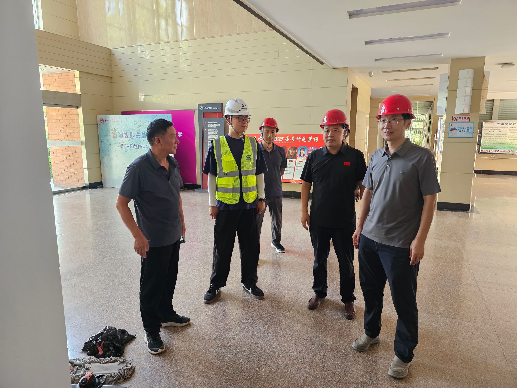 8月1日上午,副校长武玉国、后勤处处长王勇带领后勤处相关人员项目监理,深入校园各个维修现场,开展暑期修缮工作专项检查。此次检查紧扣学校教育教学审核评估专家路线保障、安全稳定十件实事落实及教室宿舍空间暑期维修等重点任务,实地督导工程质量、进度与安全管理,为秋季学期顺利开学及审核评估工作扎实推进筑牢基础。