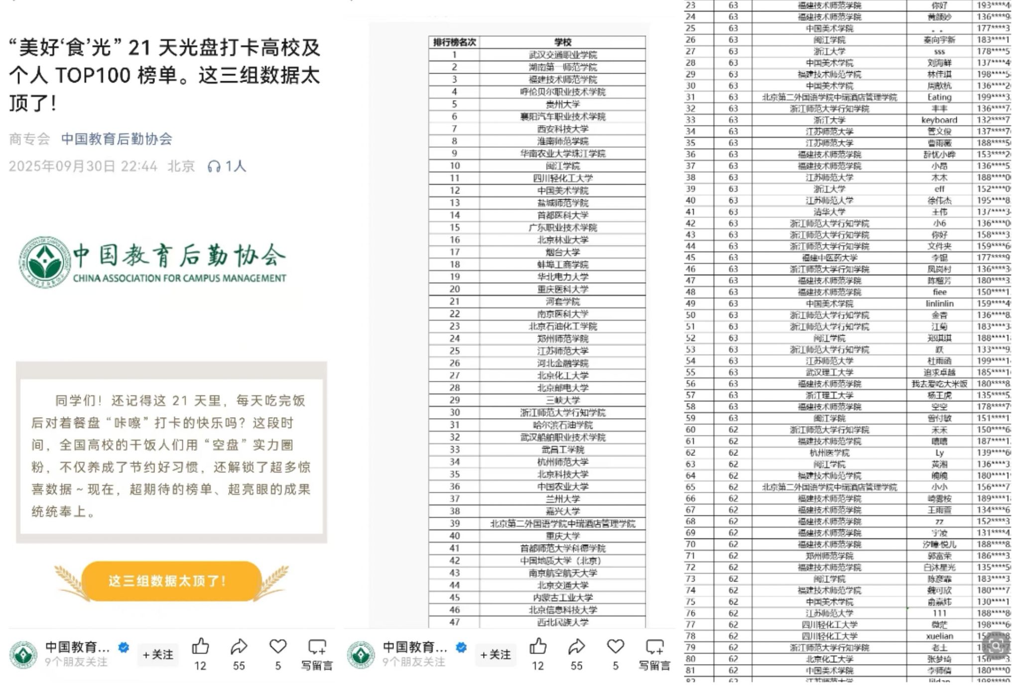 我校参与由中国教育后勤协会举办的“美好‘食’光——你光盘・我有礼”首期活动圆满收官。该活动不仅掀起校园节约热潮,更在中国教育后勤协会全国高校光盘行动评选中斩获佳绩,学校位列第24名、郭富荣同学个人排名第71名,跻身全国前100。